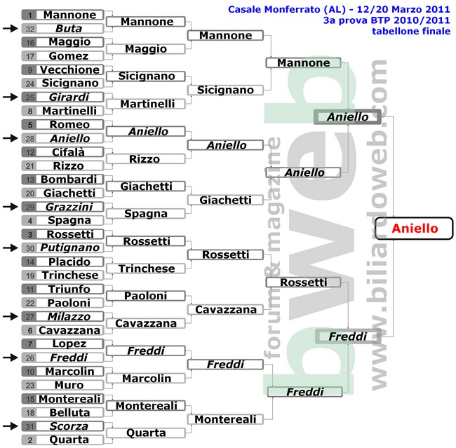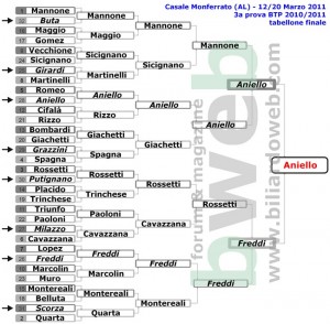Aniello si Aggiudica La 3^a Prova Del Circuito BTP Specialità Stecca A Casale Monferrato presso il CSB L’Insonnia dove, sullo spettacolare Biliardo CAVICCHI Evolution supera dopo una combattutissima  partita per 3 a 2 Freddi , nella semifinale Aniello ha Battuto dopo una splendida gara Mannone che, come al solito , si è dimostrato un grande persona complimentandosi con lui dopo la sconfitta.                                                         Era da Tempo che non si incontravano due Finalisti Provenienti da Selezioni