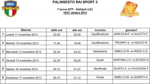 Per tutti gli appassionati,amatori del biliardo sportivo nazionale alleghiamo palinsesto televisivo delle gare dal 19 al 27 Ottobre 2013 a Gallipoli (LE) della prima prova BTP del 15° campionato Italiano Professionisti 2013/2014