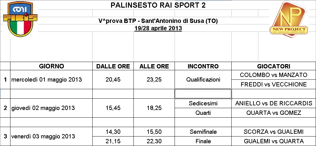 Per tutti gli appassionati,amatori del biliardo sportivo nazionale alleghiamo palinsesto televisivo delle gare dal 19 al 28 Aprile 2013 a Sant’Antonino (TO) della quinta prova BTP del 14° campionato Italiano Professionisti 2012/2013