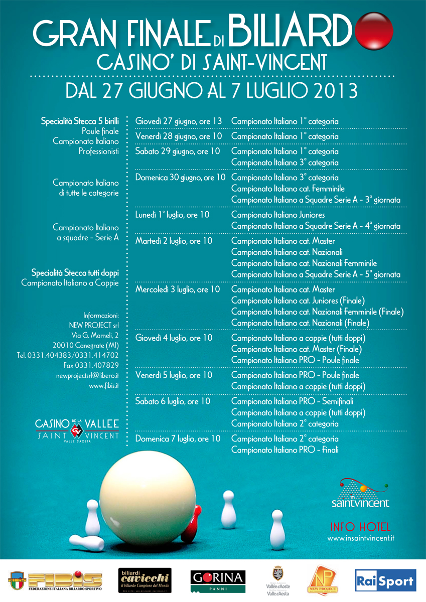 Per tutti gli appassionati,amatori del biliardo sportivo nazionale alleghiamo il programma delle gare dal 27 Giungo al 7 Luglio 2013 a Saint Vincent (AO) in occasione del Poule finale BTP del 14° campionato Italiano Professionisti 2012/2013