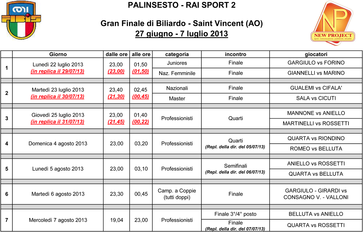 Per tutti gli appassionati,amatori del biliardo sportivo nazionale alleghiamo palinsesto televisivo delle gare dal 27 Giugno al 7 Luglio 2013 a Saint Vincent (AO) del Gran Finale di biliardo del 14° Campionato Italiano BTP 2012/2013