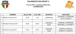 Per tutti gli appassionati,amatori del biliardo sportivo nazionale alleghiamo palinsesto televisivo delle gare dal 1 al 10 Marzo 2013 a Campione D’italia (CO) della quarta prova BTP del 14° campionato Italiano Professionisti 2012/2013