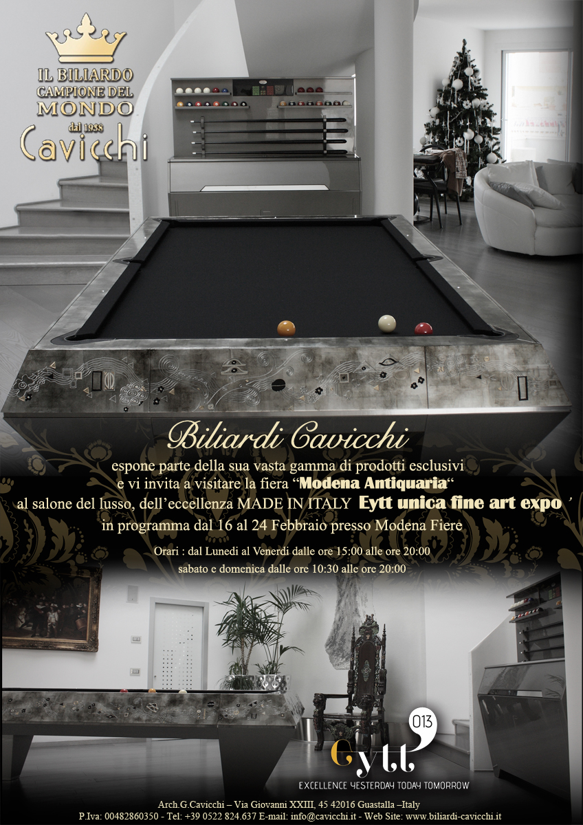 biliardi CAVICCHI vi invita alla fiera MODENA ANTIQUARIA dove verranno esposti alcuni dei prodotti della gamma esclusivi griffati CAVICCHI , saremo presenti nel plesso EYTT il salone del lusso , dell’eccellenza del Made in Italy in programma dal 16 al 24 Febbraio.