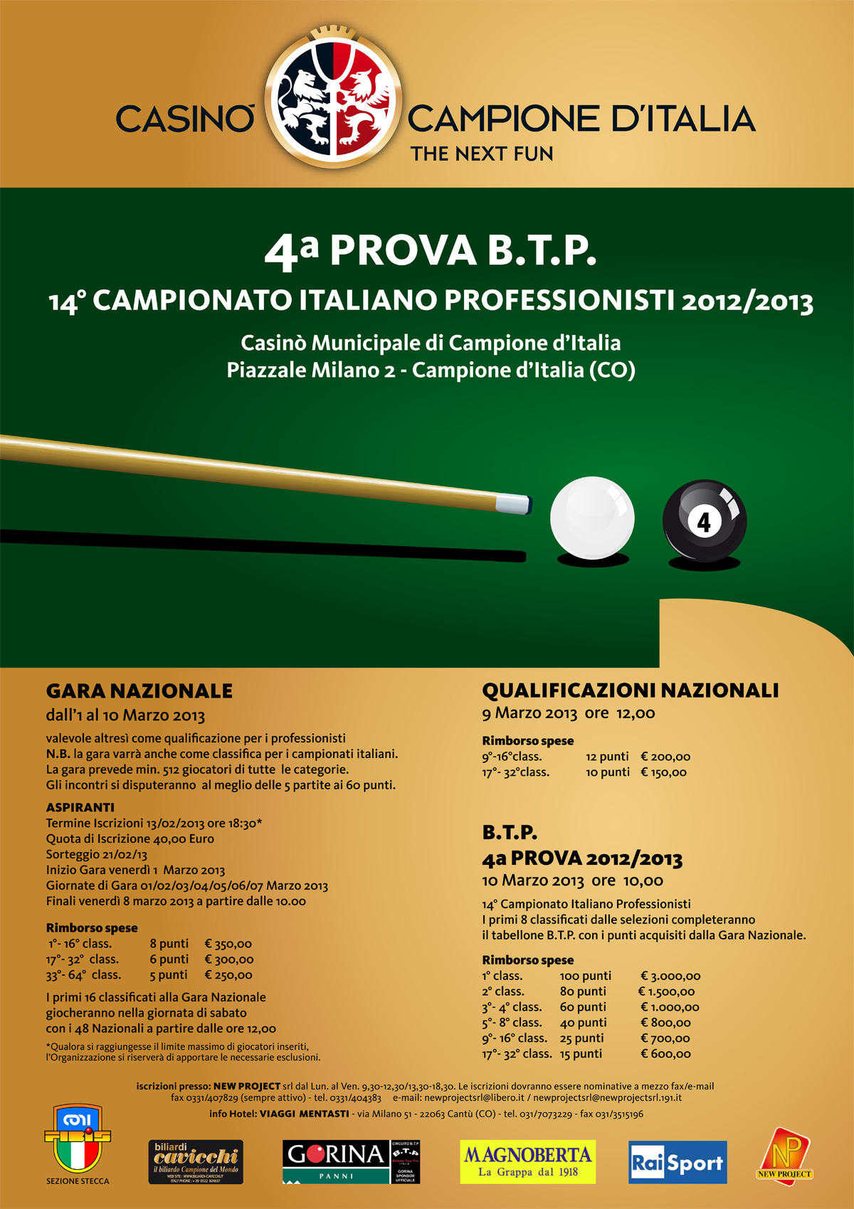 Per tutti gli appassionati,amatori del billiardo sportivo nazionale ricordiamo che dal 1 al 10 Marzo 2013 si disputerà al Casinò Municpale Campione D’Italia di Como la quarta prova BTP del 14° campionato Italiano Professionisti 2012/2013.