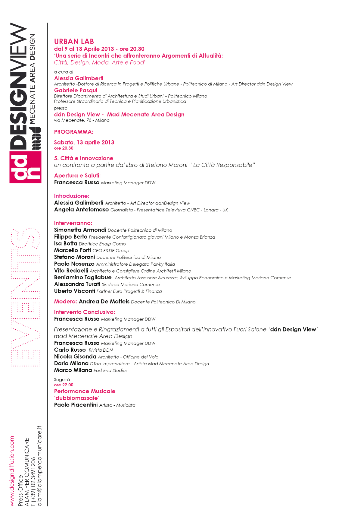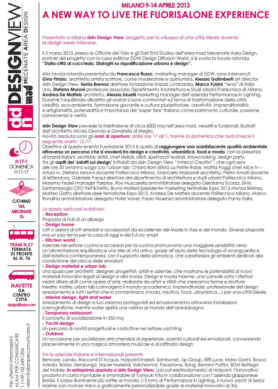 ddn Design View è un progetto di ddn che prevede lo sviluppo di una città ideale durante la Design Week Milanese, all’interno dell’area Mad – Mecenate Area Design – partner dell’operazione insieme alla casa editrice DDW Design Diffusion World.