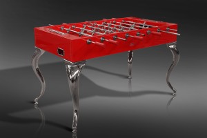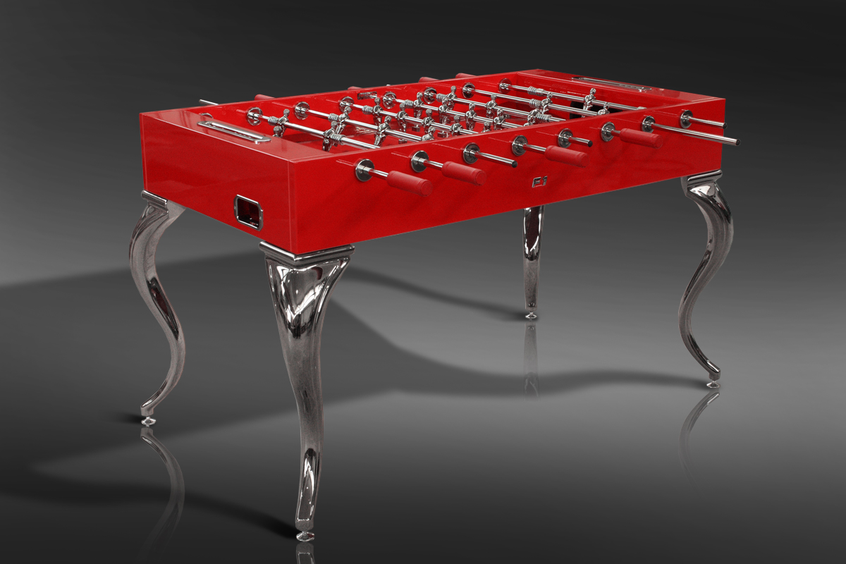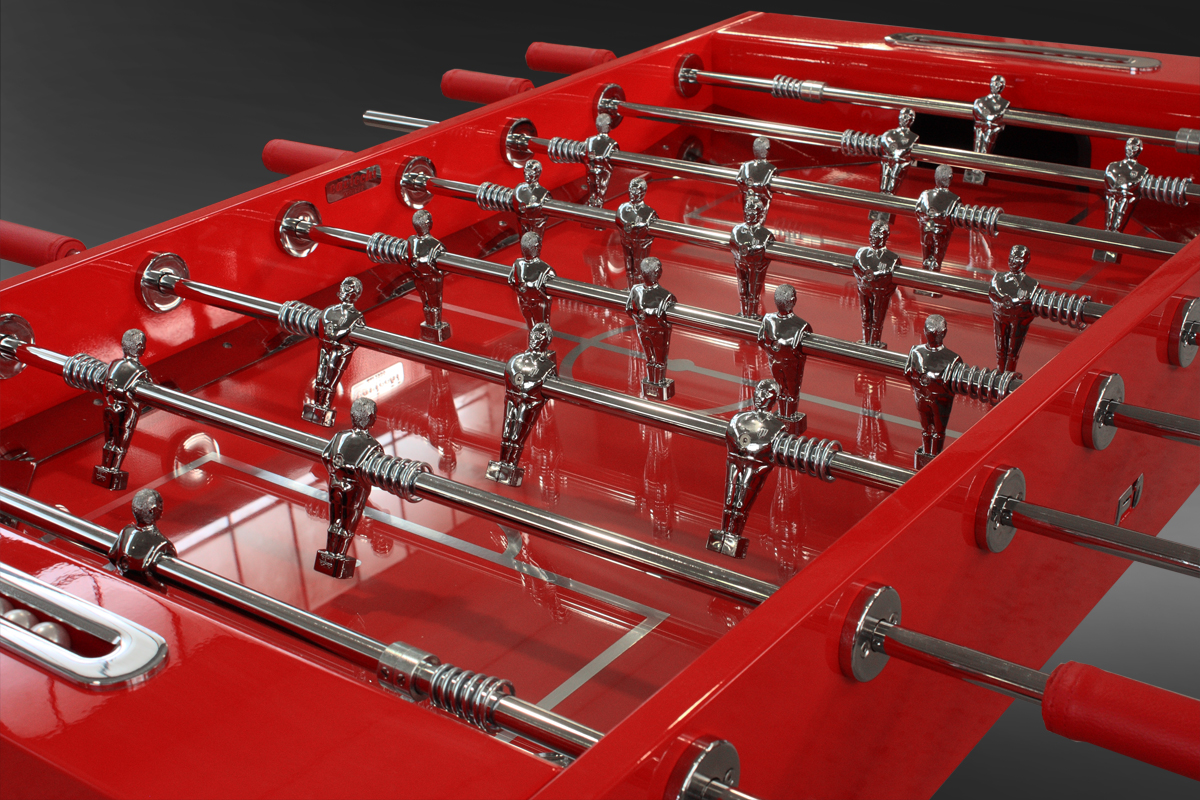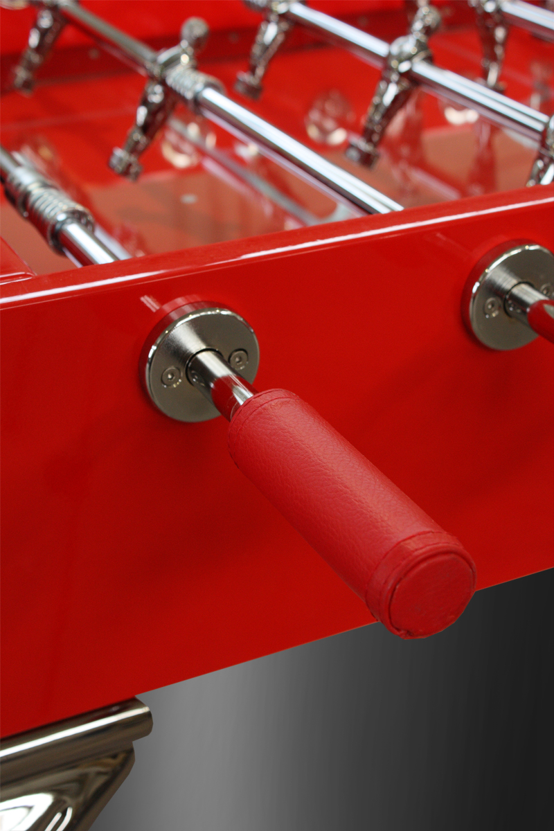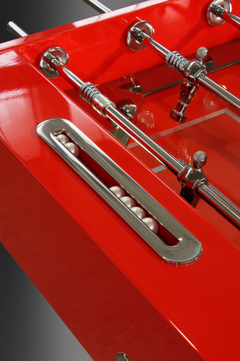 Versione Esclusiva del calcetto Opera design ,nella speciale ed esclusiva Laccatura Rosso Lucida che richiama la famosa scuderia automobilistica italiana Ferrari , dettagli e finiture tutte cromate a specchio , basi in finitura acciaio , segnapunti con cromature in metallo lucido , sfere madreperlate , Manopole in vera pelle nella stessa tonalità della laccatura rossa del calcetto con cuciture sapientemente eseguite a mano , rendono questo calcetto un vero gioiello di carattere e tendenza .