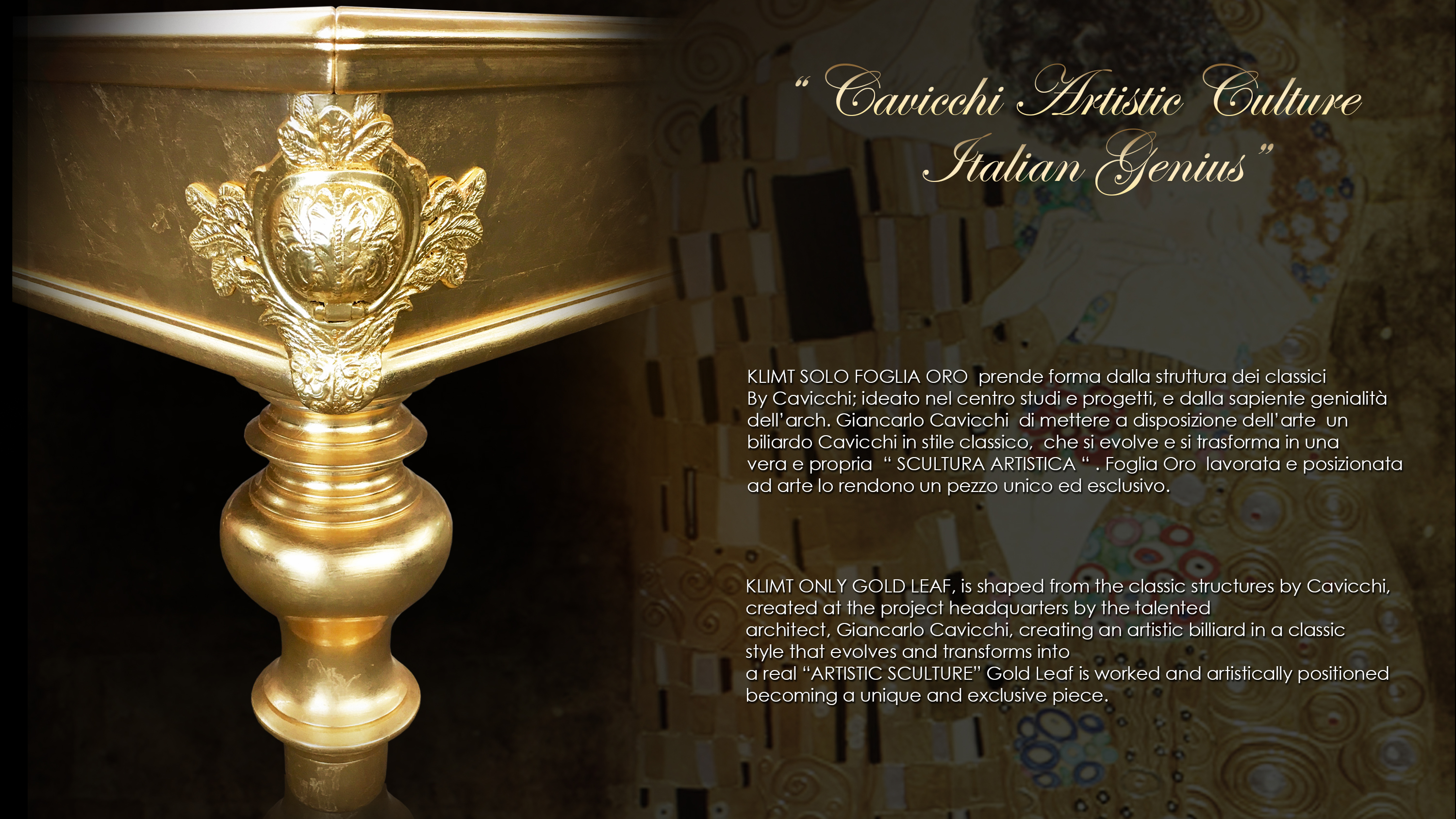 Solo mesi di lavoro collaborativo in equipe di specialisti ognuno leader nel suo ruolo e trascinati da una grande passione, possono dare vita ad una opera come il biliardo Klimt solo Foglia Oro.